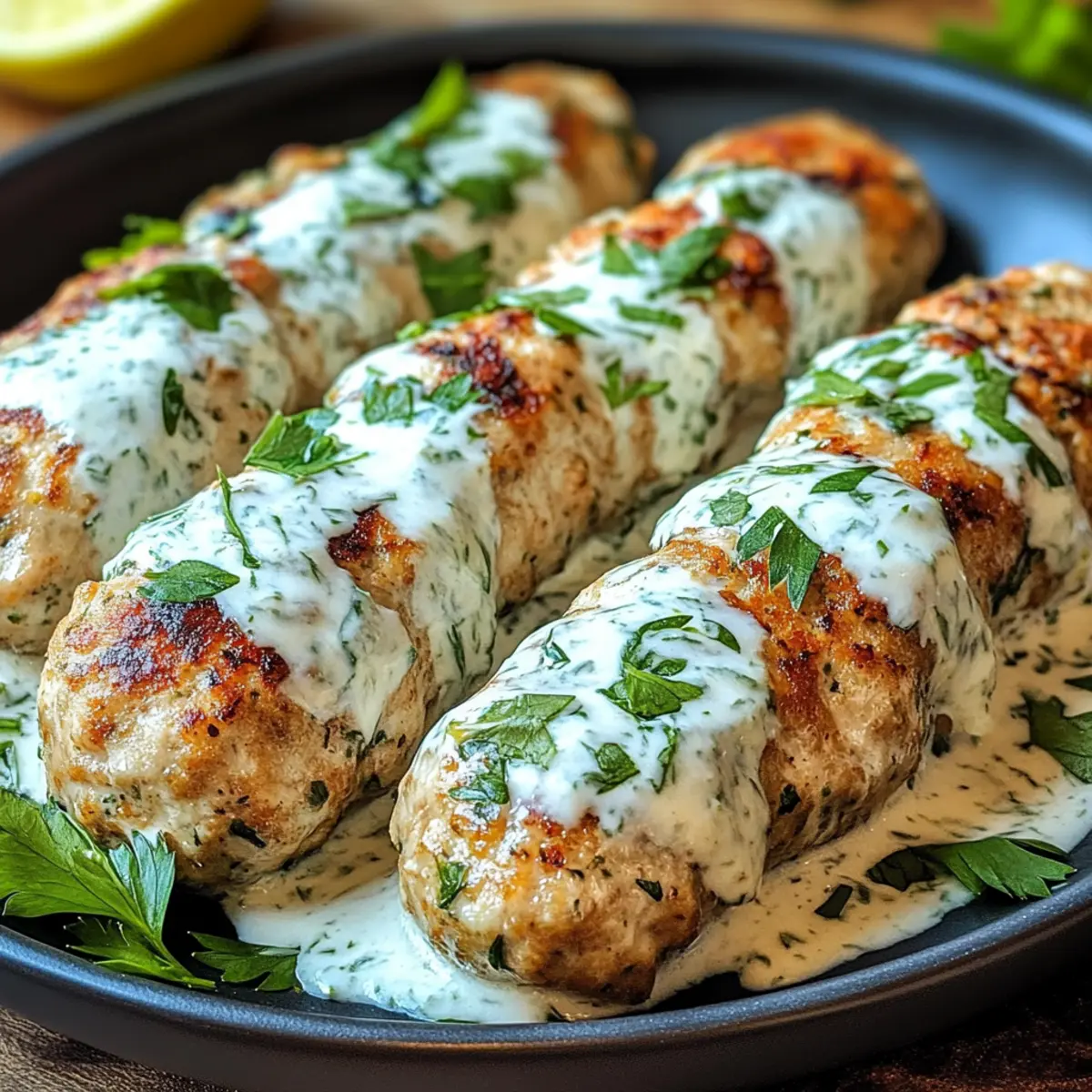 Enjoy this Irresistible Chicken Kofta with Creamy Garlic Yogurt Sauce Recipe, perfect for a quick and flavorful weeknight dinner.