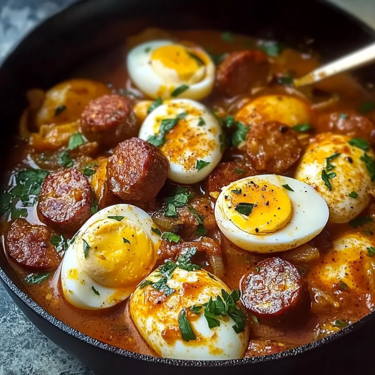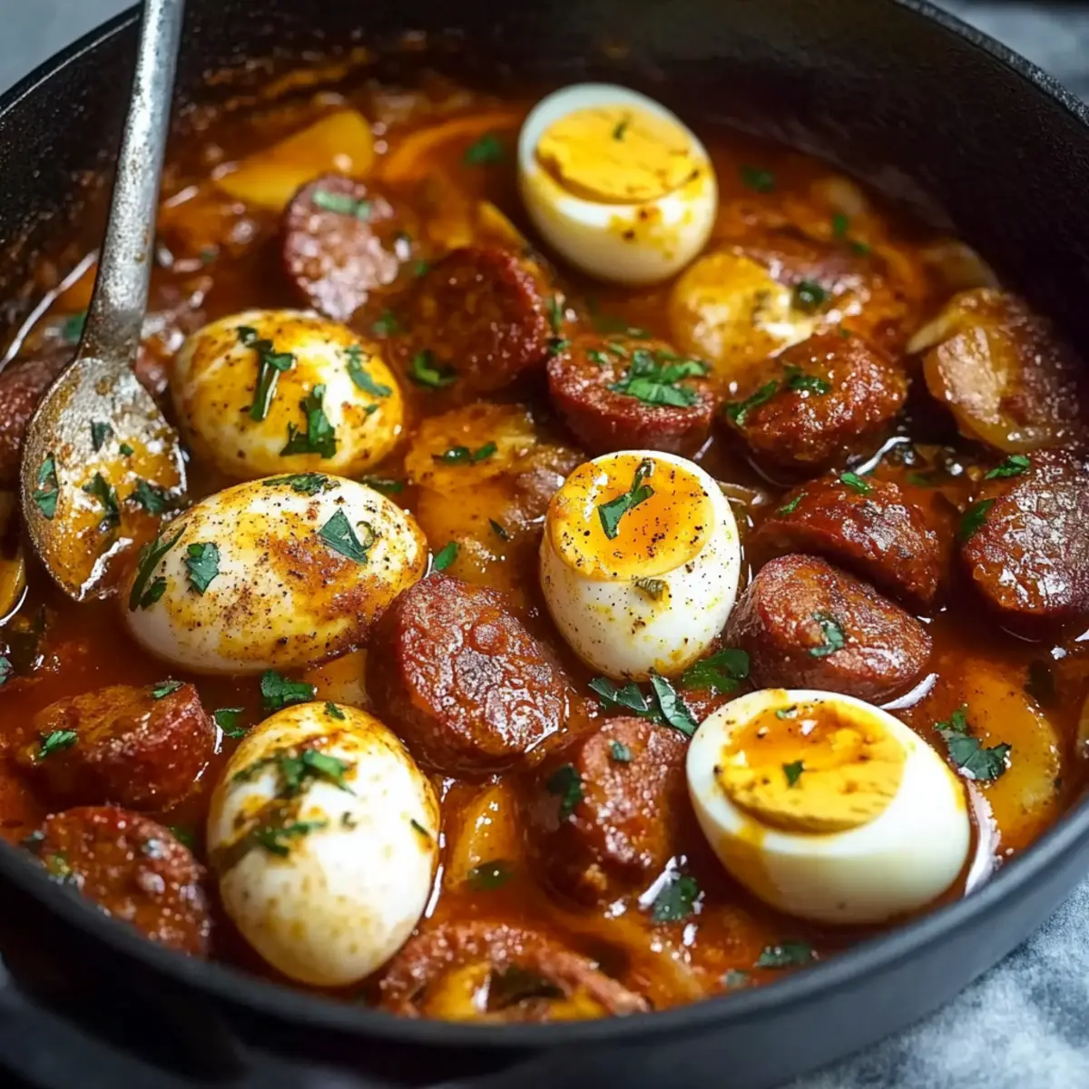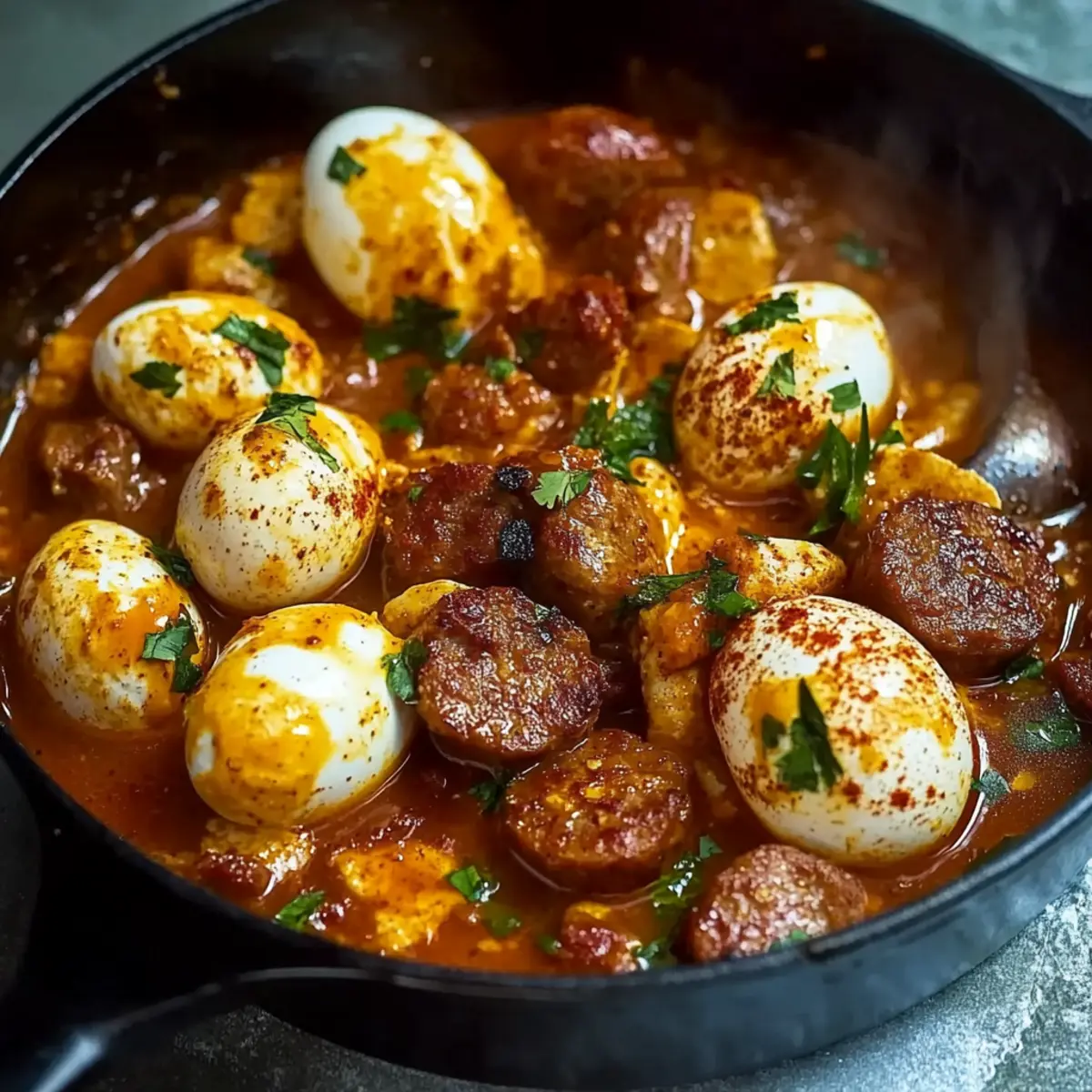 Combine the Eggs: Gently add the peeled eggs into the skillet with the sausage and spices. Simmer on low for 2-3 minutes, allowing the eggs to absorb those wonderful flavors.